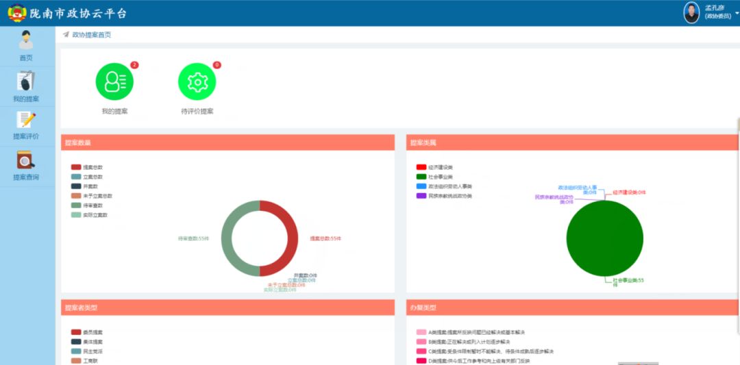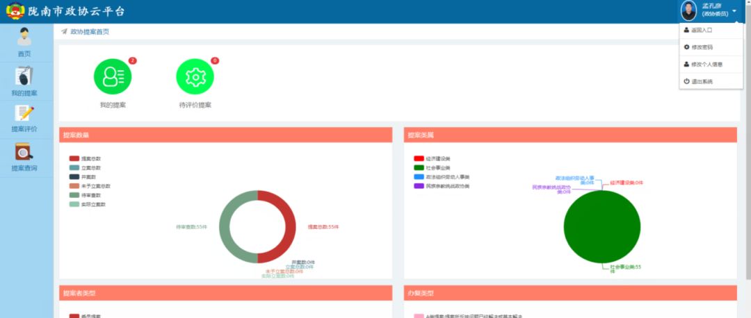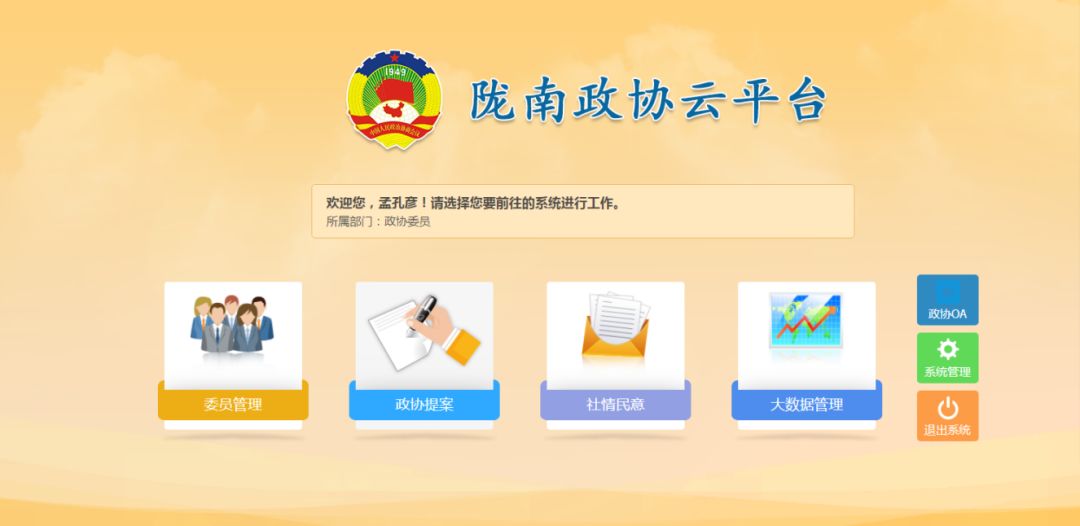 选择“政协提案”、“委员管理”、“社情民意”任意模块进入子系统。如下图: