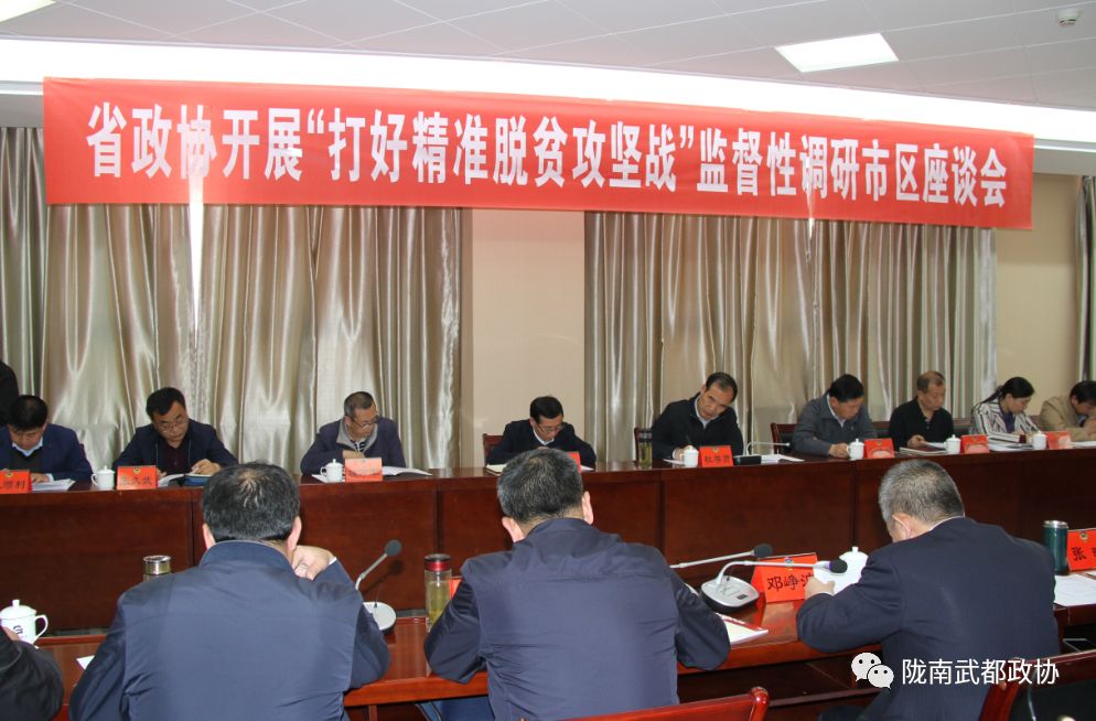 14日下午,调研组召开座谈会,陇南市委常委、副市长邓峥波、武都区政府副区长牛军平分别汇报了市、区脱贫攻坚工作开展情况,市、区扶贫、财政、农牧、农办等部门负责人和武都区玉皇乡、隆兴乡、蒲池乡党委书记分别作了发言。市政协主席张昉主持会议,市政协副主席郑作栋、区政协主席贾周云等市、区领导及有关单位主要负责同志参加座谈会。