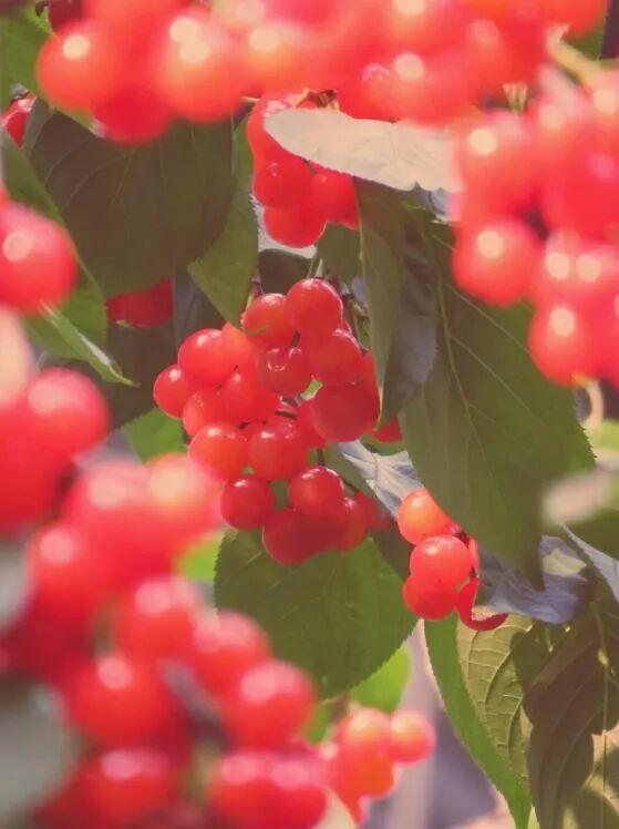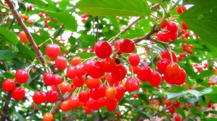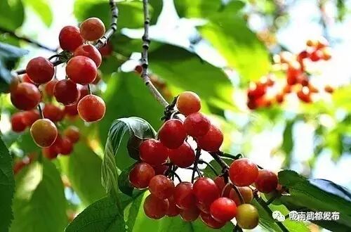 曾觌将樱桃红熟挂满枝头的景象比作璀璨繁星,将新摘入竹篮的樱桃比作绛珠,也是再贴切不过了。每年樱桃成熟的时节,密密麻麻的果粒点缀在绿叶之间,翡翠叶配玛瑙珠,煞是惹眼。轻摘一颗噙入口中,嫩滑爽弹,忍不住轻咬一口,蜜汁爆裂,甜到嘴里,沁入心底。城里头,大街小巷清一色的竹篮一字排开,篮子里满是熟透的新鲜樱桃,状似珍珠,色如玛瑙,珠圆玉润,玲珑剔透。还有些果农拎着竹篮四处售卖,这时节,城管同志似乎也会网开一面,让武都人民尽情享受这珍珠聚会,玛瑙盛宴,好一个“红樱满眼日”!