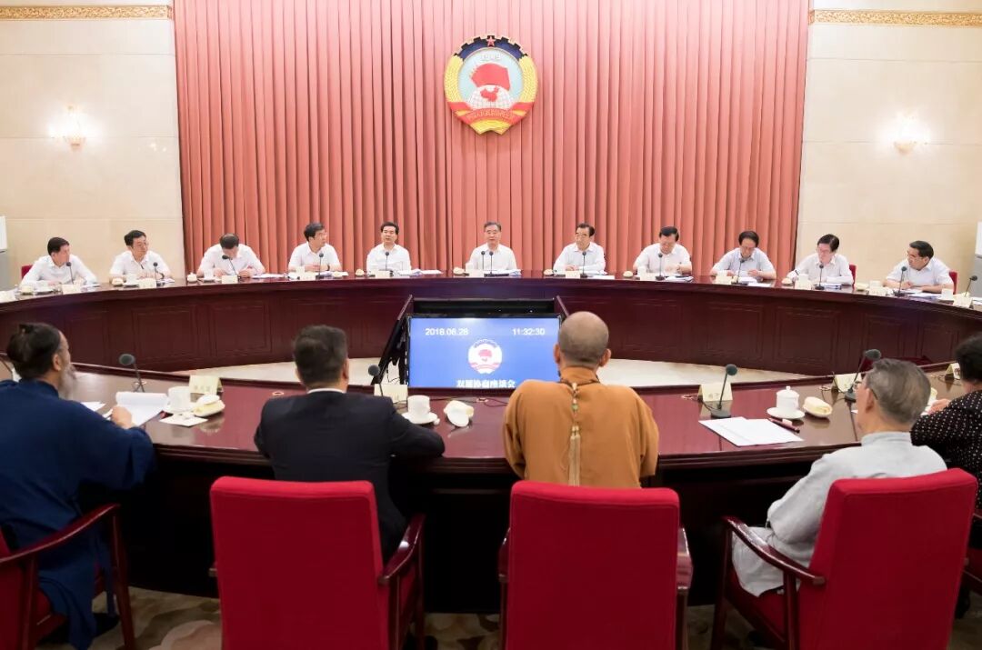 全国政协副主席巴特尔作主题发言。全国政协副主席张庆黎、王正伟、夏宝龙出席会议。全国政协委员杨小波、学诚、李光富、班禅额尔德尼·确吉杰布、王秀军、罗正富、胡诚林、黄晓薇、樊绪银、祁志峰、安七一、刘莉、刘晓梅、宗性,学者楼宇烈在会上发言。中央统战部负责人介绍了有关情况,中央网信办、国家发展改革委、文化和旅游部、证监会负责人做了交流互动。